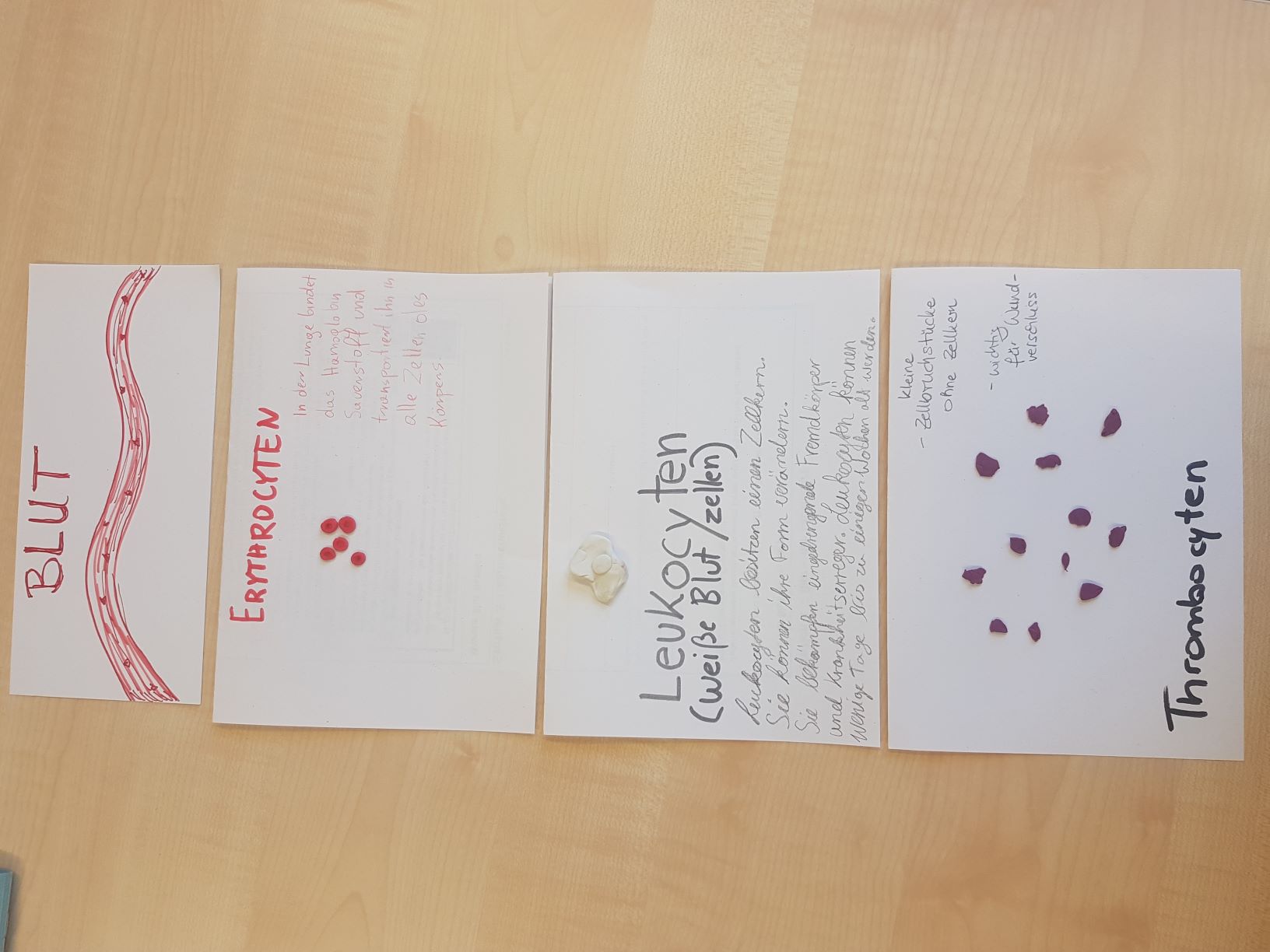Da ich mir selbst die ganzen Fachbegriffe der Blutbestandteile (Thrombozyten usw) nicht merken konnte, wir auch leider kein Mikroskop vor Ort haben, brachte ich zur nächsten Stunde Knete mit. Aus dieser formten wir dann die einzelnen Blutbestandteile aus Knete nach. Daraus gestalteten wir eine kleine Ausstellung: Neben den gekneteten Blutplättchen lagen Kurzbeschreibungen unserer „Exponate“. Diese blieben dort einige Wochen liegen, und irgendwann konnten wir uns alle die Begriffe merken.